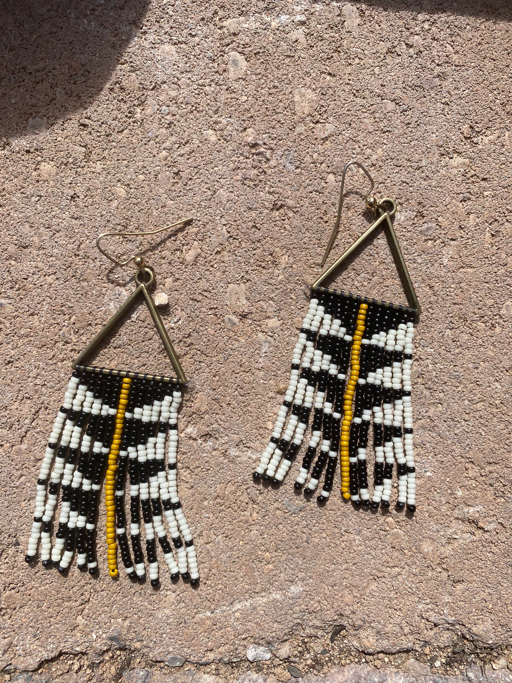 Bold, modern, and full of movement – these handmade beaded fringe earrings bring an earthy elegance to any outfit. Designed and handcrafted by MazurMade in Santa Fe, NM, they feature a striking geometric pattern of black and white beads with a pop of mustard yellow running down the center. These earrings make a statement while staying lightweight and comfortable for all-day wear.