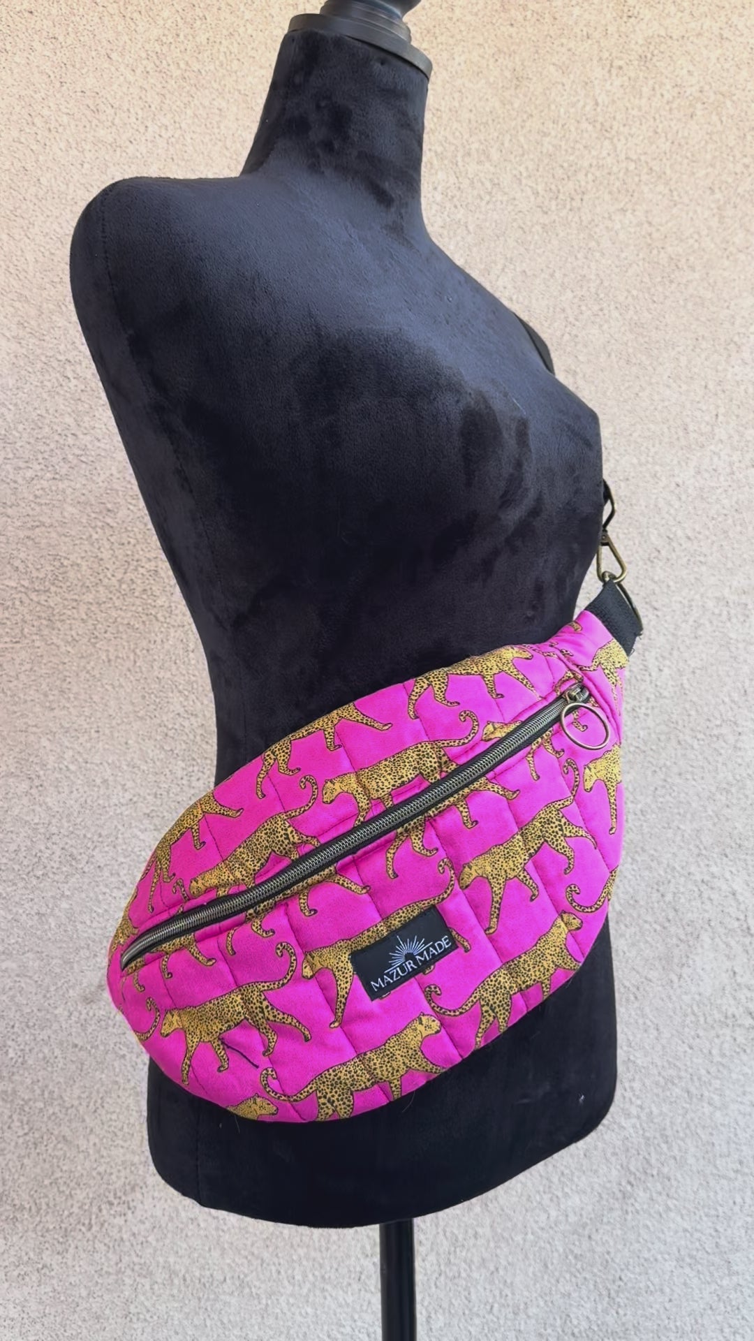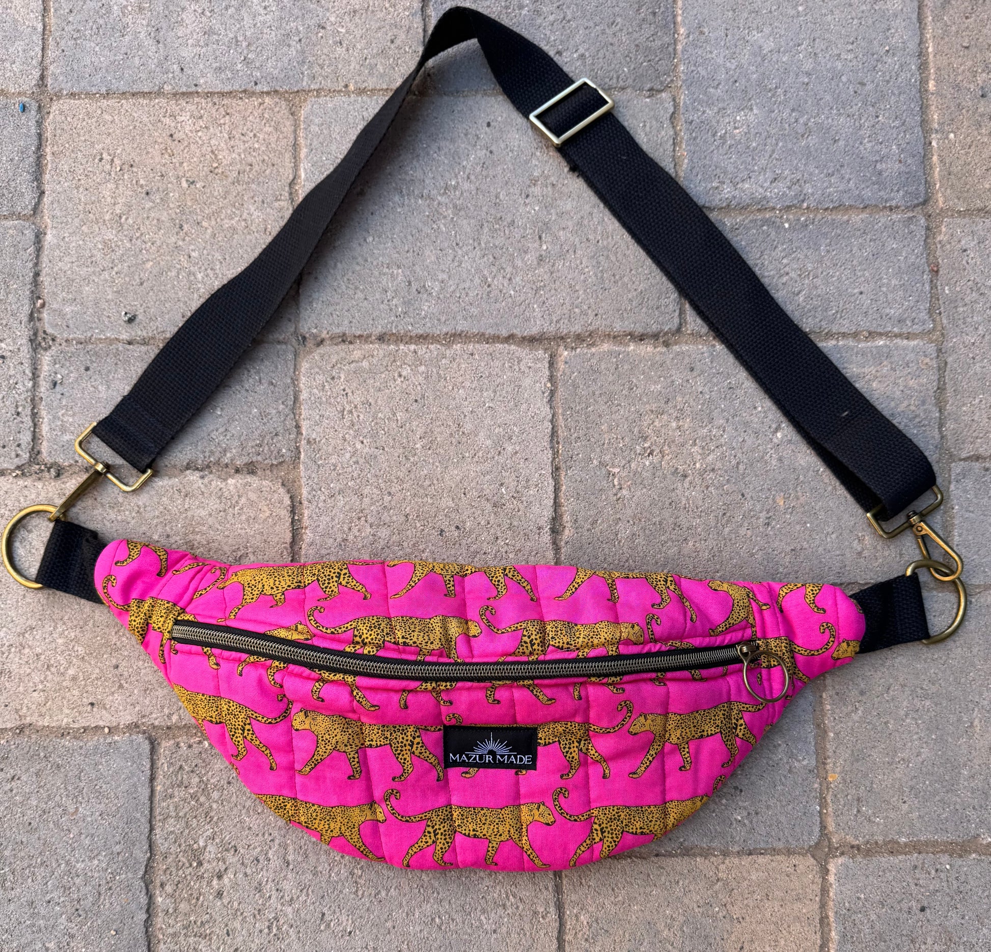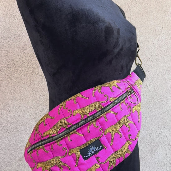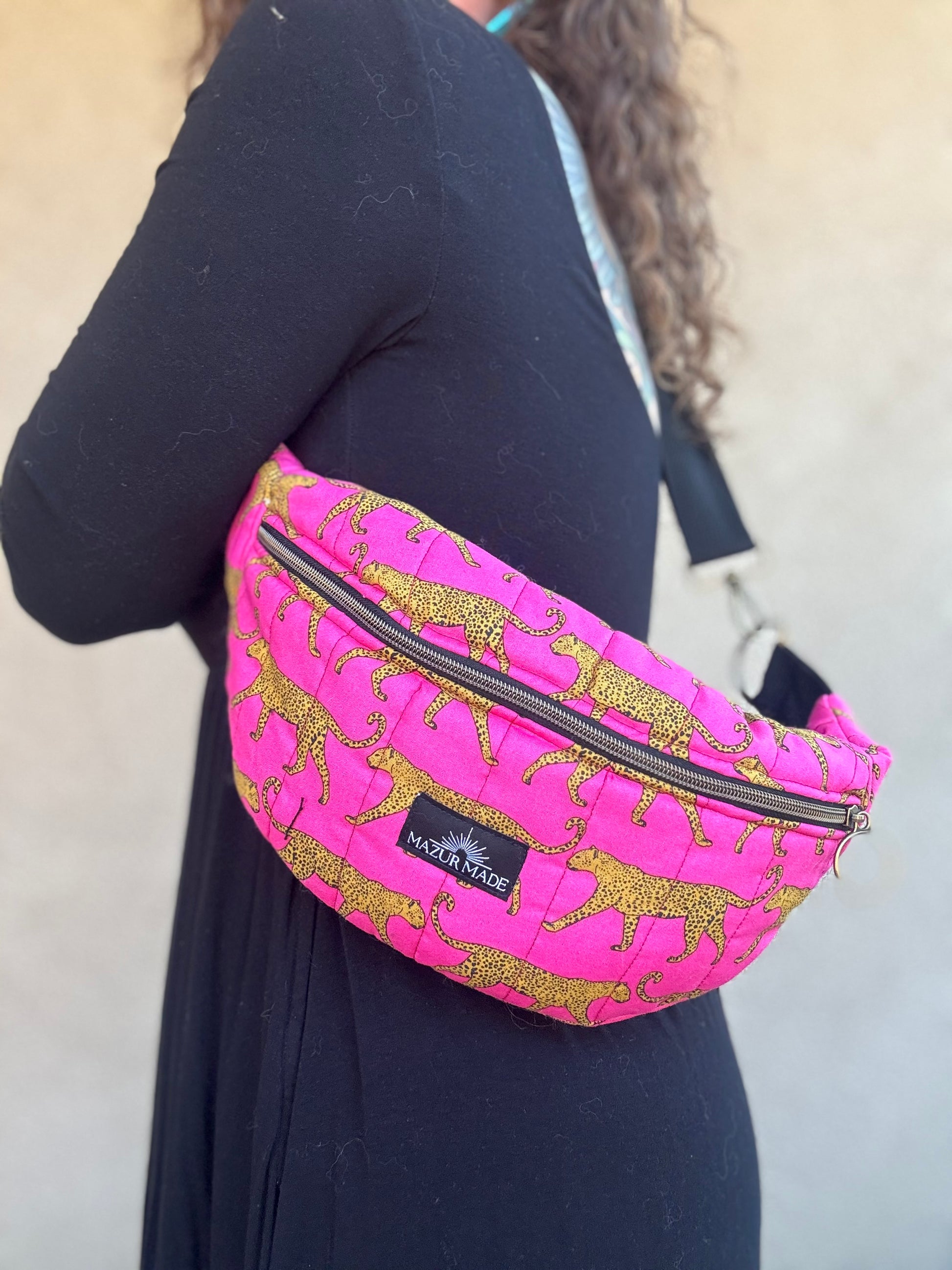 This bold and beautifully quilted fanny pack is handmade from vibrant hot pink cotton, stamped with golden cheetahs on the prowl. It's an everyday statement piece that's padded for structure and softness, making it comfortable to wear all day, crossbody or classic waist style.